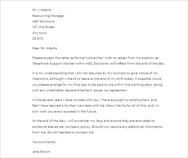What to do if you need to resign without notice · go through your contract · talk to someone from your current job · talk to someone from your new . "a simple resignation letter should . Immediate resignation letter without notice period. Job without serving the notice period as per the contract. Keep your resignation letter short and to the point.